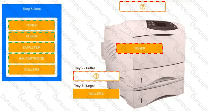 Using the available printer parts, replace only the faulty components on the office printer to resolve the stated issues.