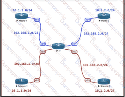 The Math and Science departments connect through the corporate. IT router but users in the Math department must not be able to reach the Science department and vice versa Which configuration accomplishes this task?