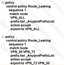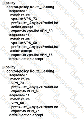 An enterprise has several sites with multiple VPNs that are isolated from each other A new requirement came where users in VPN 73 must be able to talk to users in VPN 50 Which configuration meets this requirement?
