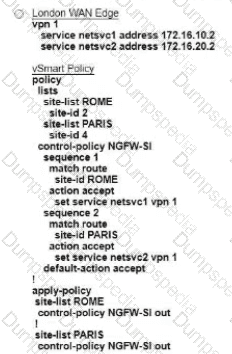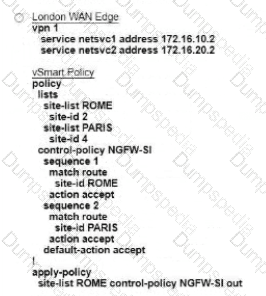Refer to the exhibit. The Cisco SD-VYAN is deployed using the default topology. The engineer v/ants to configure a service insertion policy such that all data traffic between Rome to Paris is forwarded through the NGFW located in London. Which configuration fulfills this requirement, assuming that the Sen/ice VPN ID is 1?