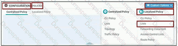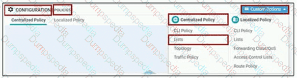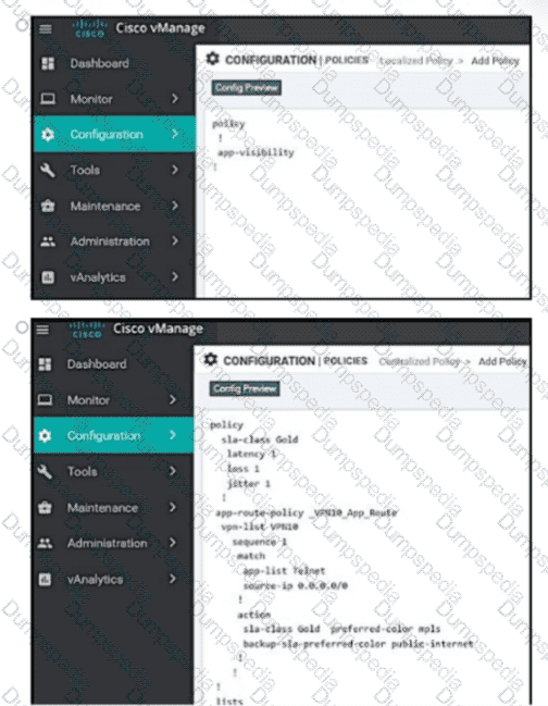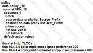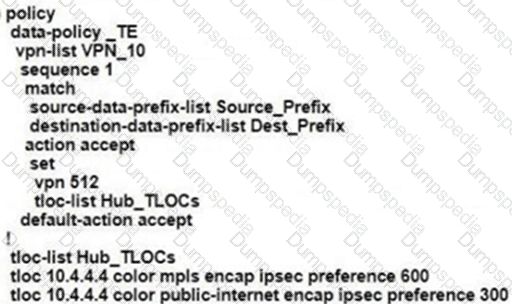 Refer to the exhibit The Cisco SD-WAN network is configured with a default full-mesh topology. Islamabad HQ and Islamabad WAN Edges must be used as the hub sites. Hub sites MPLS TLOC must be preferred when forwarding FTP traffic based on a configured SLA class list. Which policy configuration does the network engineer use to call the SLA class and set the preferred color to MPLS?