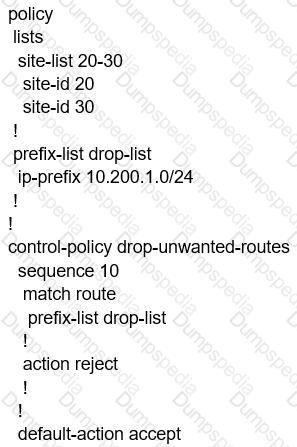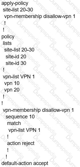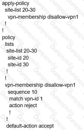 When the VPN membership policy is being controlled at the vSmart controller, which policy disallows VPN 1 at sites 20 and 30?