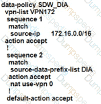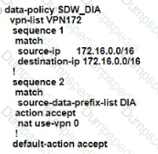 An engineer is configuring the branch office with a 172.16.0.0/16 subnet to use DIA for Internet traffic. All other traffic must flow to the central site or branches using the MPLS circuit Which configuration meets the requirement?