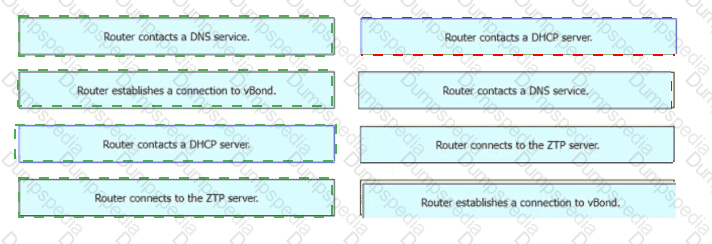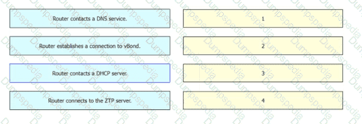 Drag and drop the steps from the left into the sequence on the right for a WAN Edge router after powering on for zero touch provisioning.