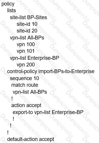 An enterprise has several sites with multiple VPNs that are isolated from each other A new requirement came where users in VPN 73 must be able to talk to users in VPN 50 Which configuration meets this requirement?