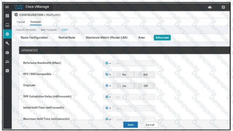 Refer to the exhibit. A network administrator is configuring OSPF advanced configuration pararmeters from a template using the vManager GUI for a branch WAN Edge router to calculate the cost of summary routes to an ASBR. Which action achieves this configuration?