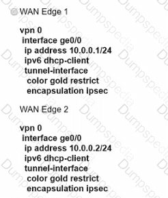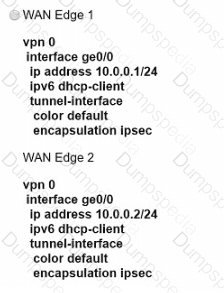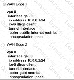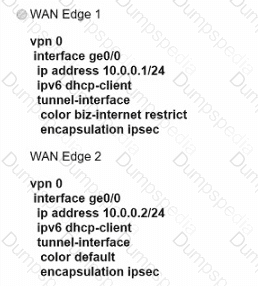 An engineer must configure two branch WAN Edge devices where an Internet connection is available and the controllers are in the headquarters. The requirement is to have IPsec VPN tunnels established between the same colors. Which configuration meets the requirement on both WAN Edge devices?