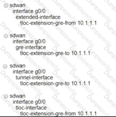 A network administrator is configuring a tunnel interface on a branch Cisco IOS XE router to run TLOC extensions. Which configuration will extend a TLOC over a GRE tunnel to another router in the branch?