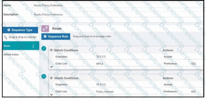 An engineering team must prepare a traffic engineering policy where an MPLS circuit is preferred for traffic coming from the Admin VLAN Internet should be used as a backup only. Which configuration fulfill this requirement?