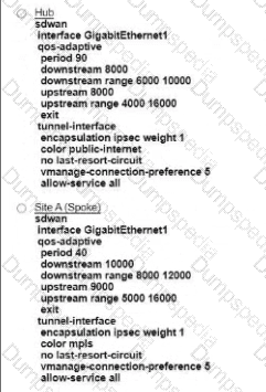 Refer to the exhibit An engineer must configure a QoS policy between me hub and site A (spoke) over a standard internet circuit where traffic shaping is adjusted automatically based on evaiiabk» bandwidth Which configuration meets the requirement?
