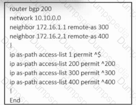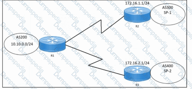 Refer to the exhibit. An engineer must configure multihoming between router R1 and service providers SP-1 and SP-2. Locally generated routes must be advertised to the service providers, and should prevent the risk that the local autonomous system becomes a transit AS for Internet traffic. Which two commands must be run on R1 to complete the configuration? (Choose two.)