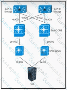 An engineer must design a solution with storage reachability between too physical servers and a storage array. The storage array connectivity is to a SAN switch that Is limited to 46 ports. Which topology meets the requirements without adding more MOS switches?