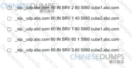 A customer reports that the load balancing solution is not working (or two Cisco Unified Border Element routers. The (cube1.abc.com) router should take 60% of the calls, and the (cube2 abc.com) router should take 40% of the calls. Assuming all DNS A records are present, which two SRV configurations would provide the desired outcome? (Choose two.)