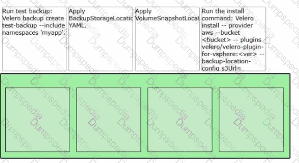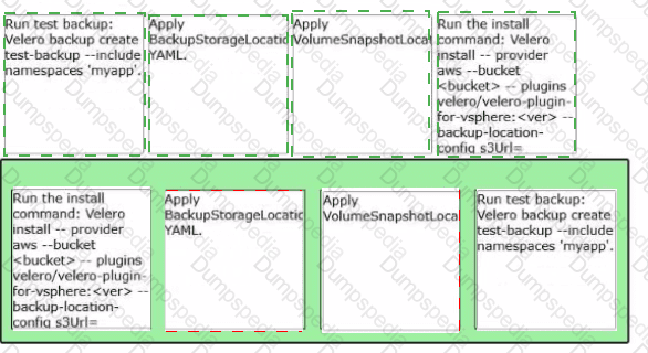 A VMware Administrator is tasked with implementing a backup and restore strategy using Velero and external object storage for the namespace ' myapp1. Arrange the steps In the correct order of operations to enable Vetero.