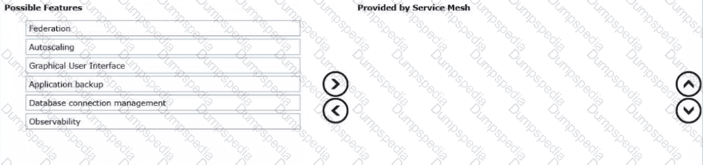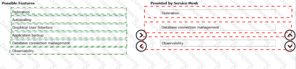 Drag and drop the three features into the correct order from Possible Features list on the left and place them into the Provided by Service Mesh on the right side. (Choose three.)