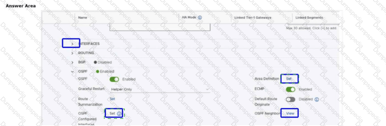 An administrator has been tasked with enabling OSPF as the routing protocol for a Tier-0 Gateway. Which two items must be configured to enable OSPF for a Tier-0 Gateway?