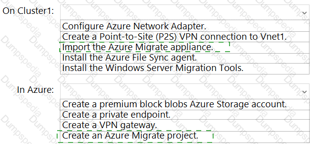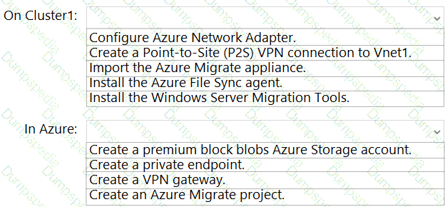 What should you do on Cluster1 and in Azure before you perform the migration? To answer, select the appropriate options in the answer area.