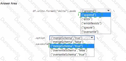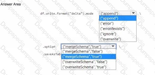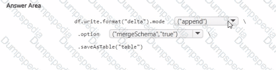You create a Spark DataFrame and assign the DataFrame to a variable named df. The DataFrame contains the new data. You need to add the new data to the Delta table to meet the following requirements: