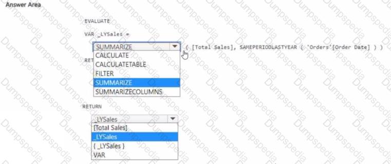 How should you complete the DAX expression? To answer, select the appropriate options in the answer area. NOTE: Each correct selection is worth one point.