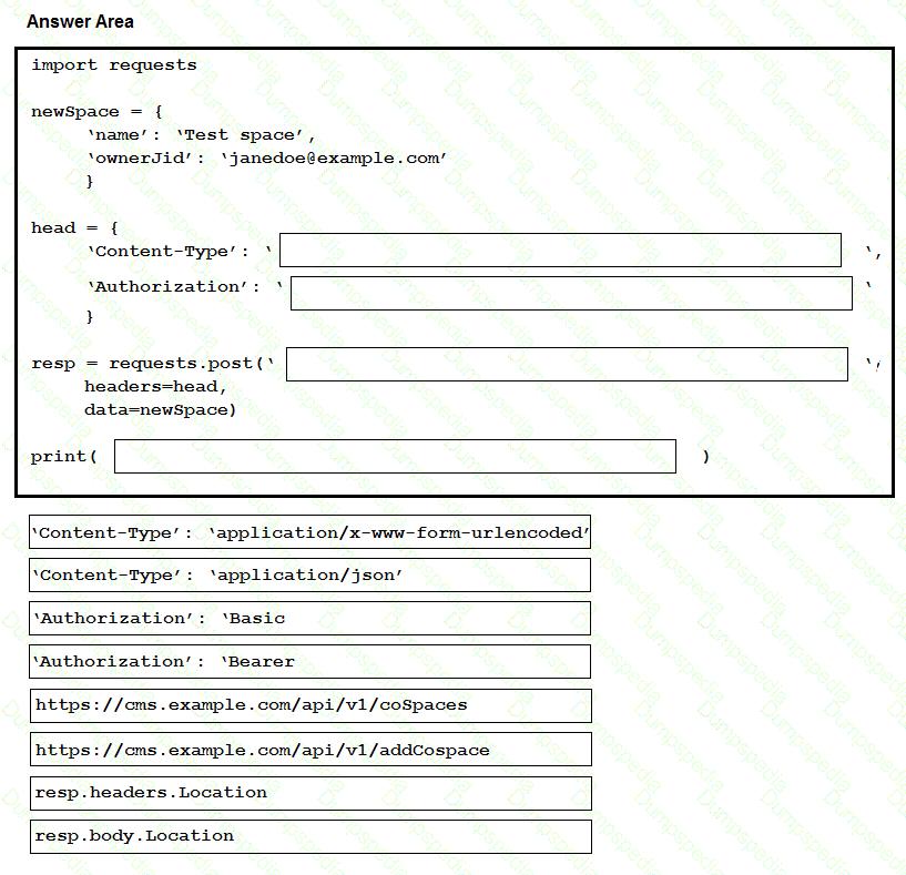 Drag and drop the code to create a valid Cisco Meeting Server REST API Python script that creates a CMS coSpace and prints the URI to the console. Not all options are used.