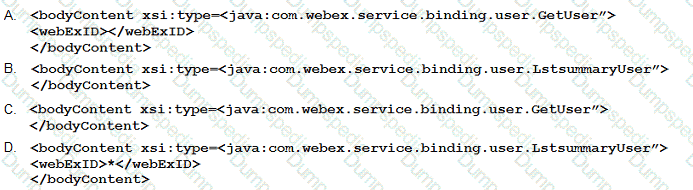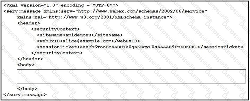 Alice is a Webex Meetings admin for her organization. Which code snippet completes a Webex Meetings XML API request that returns all users?