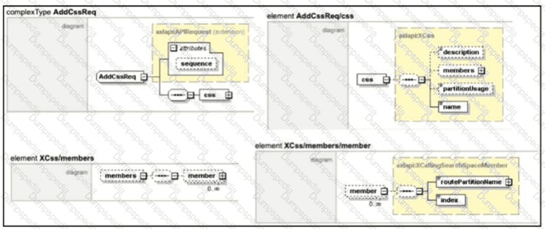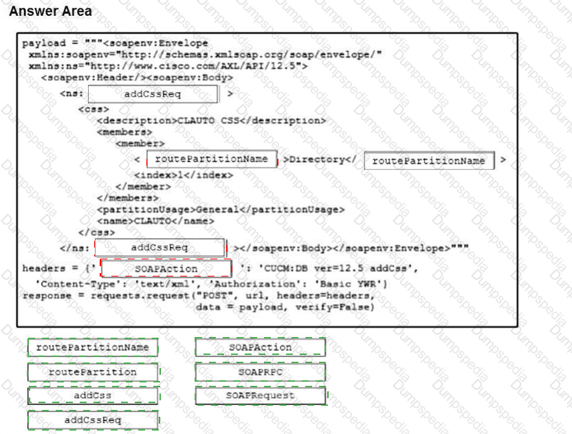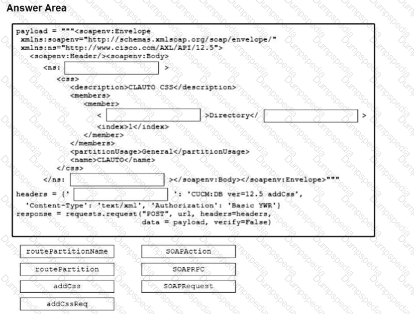 Refer to the exhibit. Drag and drop the code snippets from the bottom onto the blanks in the script to create a new CSS in Cisco UCM by using AXL with a route partition directory. Some options may be used more than once. Not al options are used.