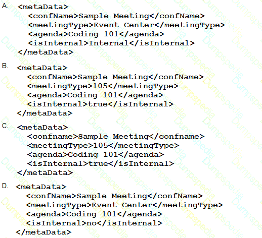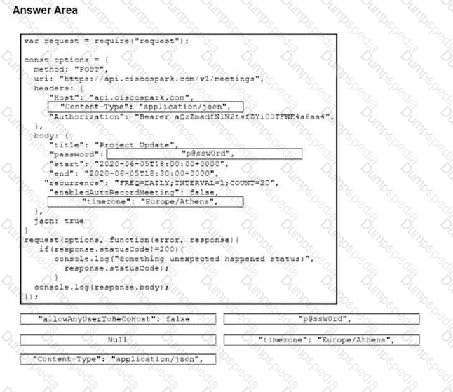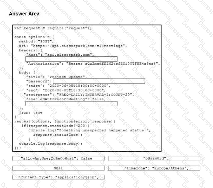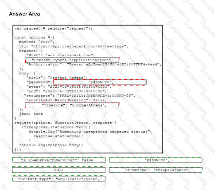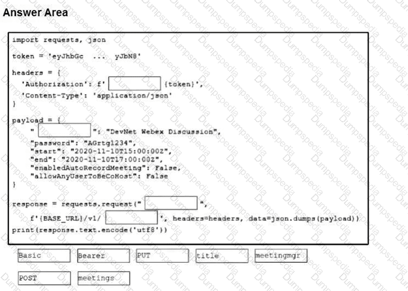 Drag and drop the code snippets from the bottom onto the blanks in the code to create a Cisco Webex Meetings meeting using the API. Not all options are used.