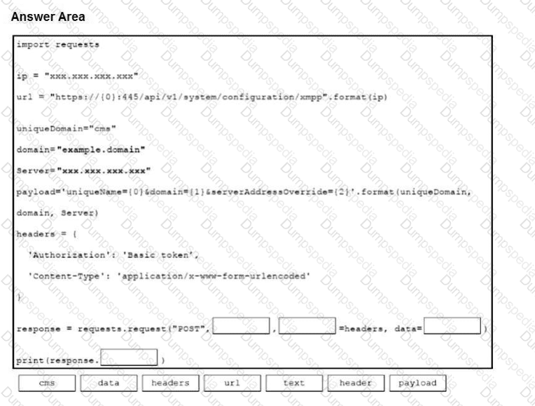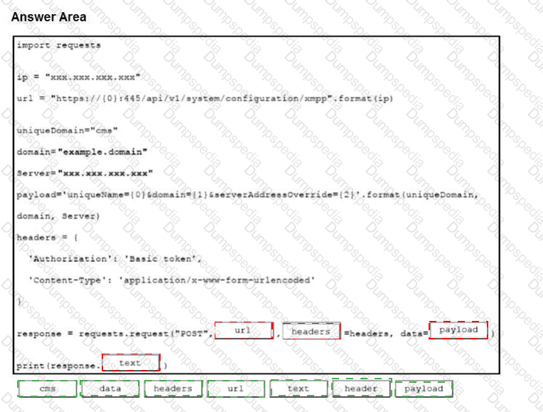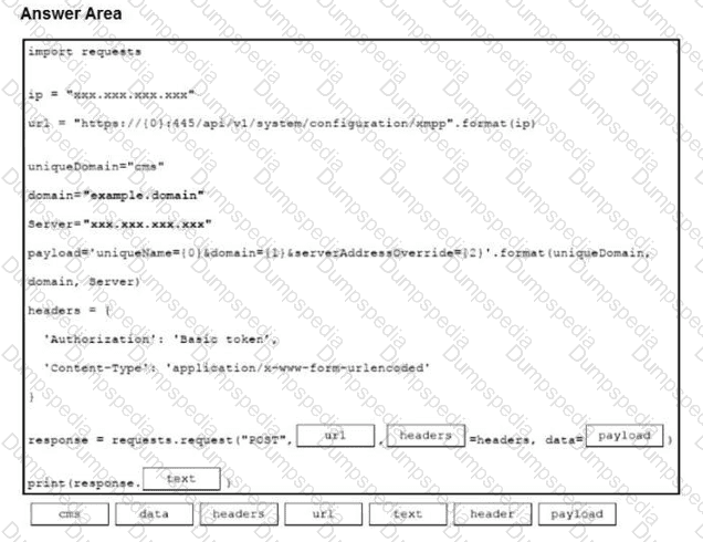 Drag and drop the code snippets from the bottom onto the blanks in the Python script to create an XMPP cluster using the Cisco Meeting Server API.