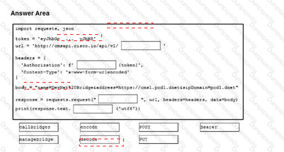 Drag and drop the code snippets from the bottom onto the blanks in the code to configure a new cal bridge using the REST API. Not all options are used.