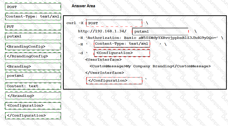 Drag and drop the commands from the left onto the curl command to create a custom branding message using the xAPI HTTP API. Not all options are used.