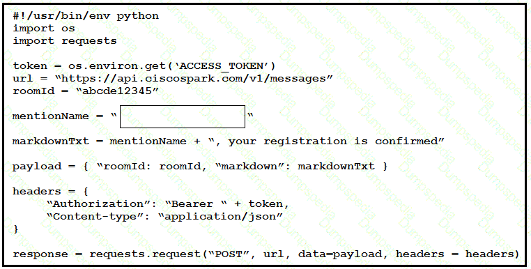A developer has implemented ChatOps to a Webex Teams space as described in the exhibit. The Python script that pushes the notifications to the Teams space is shown. Drag and drop the code to complete the script. Not all options are used.