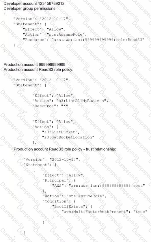 A company's cloud operations team is responsible for building effective security for IAM cross-account access. The team asks a security engineer to help troubleshoot why some developers in the developer account (123456789012) in the developers group are not able to assume a cross-account role (ReadS3) into a production account (999999999999) to read the contents of an Amazon S3 bucket (productionapp).The two account policies are as follows: