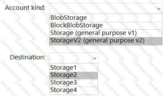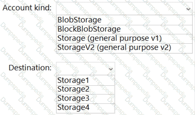 Which type of storage account should you use, and which account should you configure as the destination storage account? To answer, select the appropriate options in the answer area.