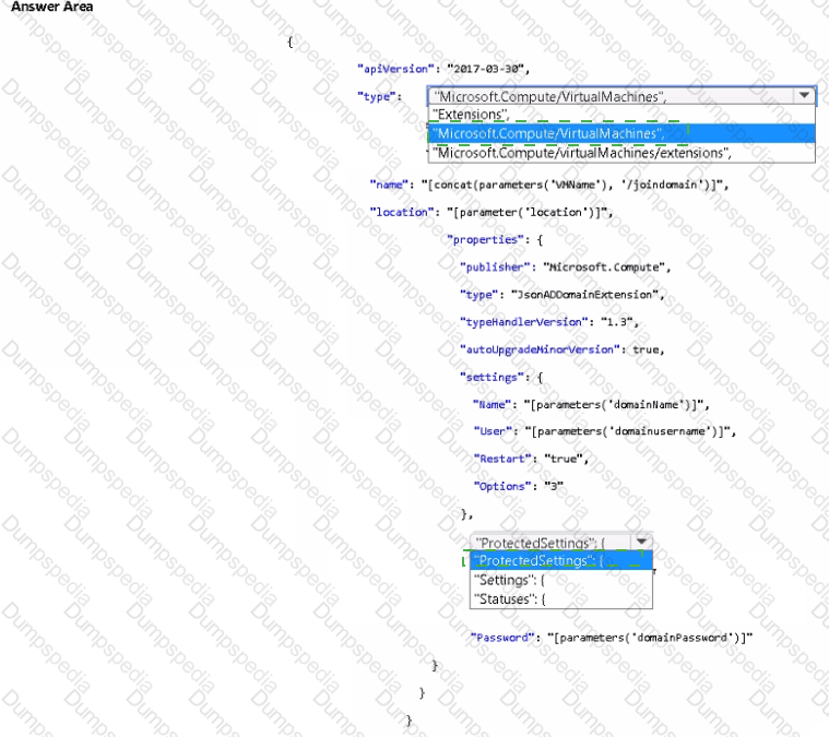 How should you complete the Azure Resource Manager (ARM) template? To answer, select the appropriate options in the answer area.