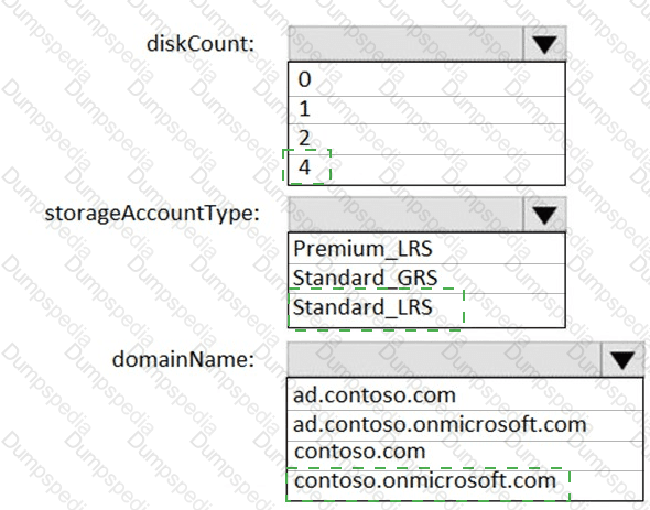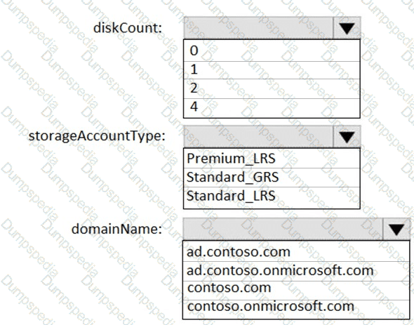 Which values should you provide for diskCount, StorageAccountType, and domainName? To answer, select the appropriate options in the answer area.
