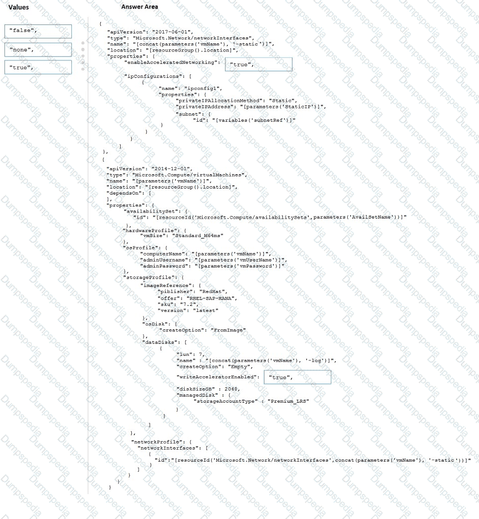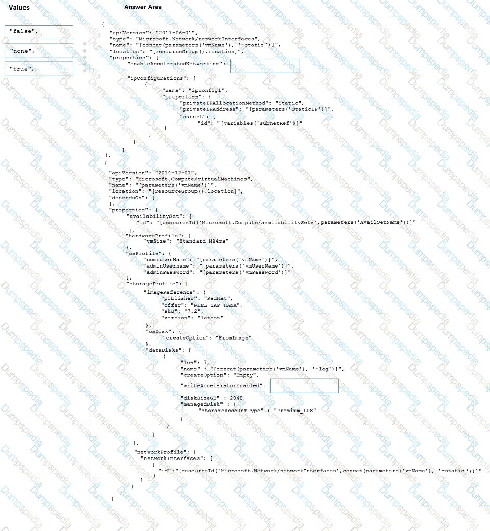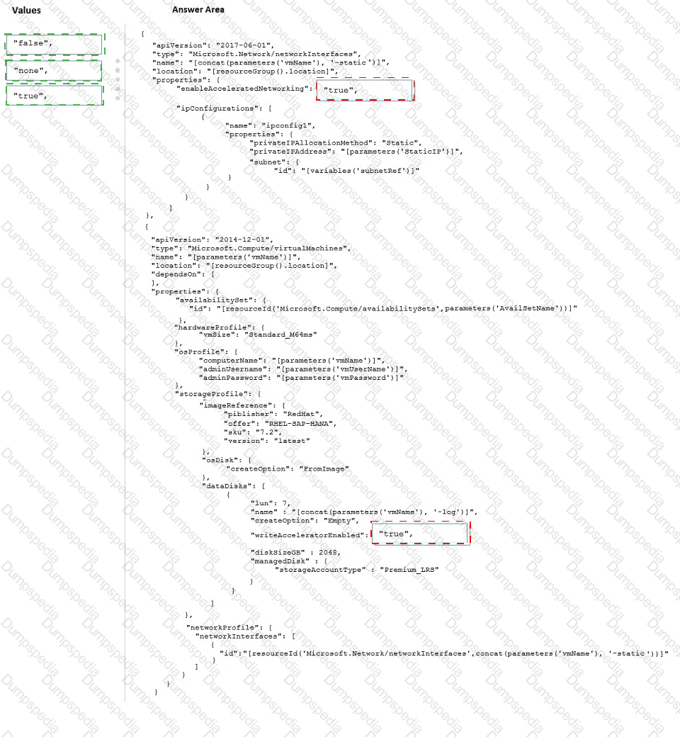 How should you configure Accelerated Networking and Write Accelerator in the template? To answer, drag the appropriate values to the correct targets. Each value may be used once, more than once, or not at all. You may need to drag the split bar between panes or scroll to view content.