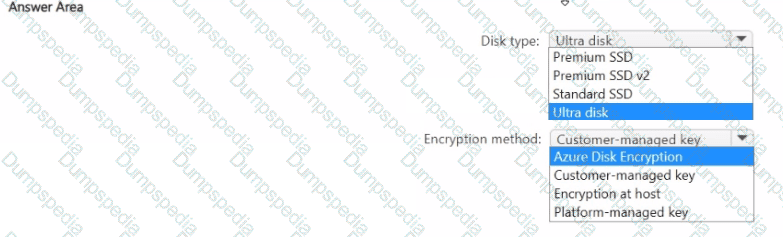 Which disk type and encryption method should you use? To answer, select the appropriate options in the answer area.