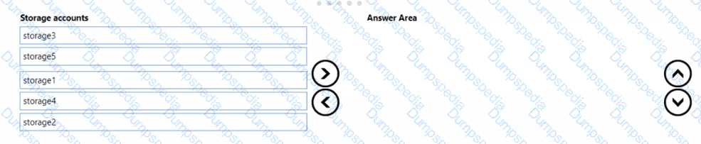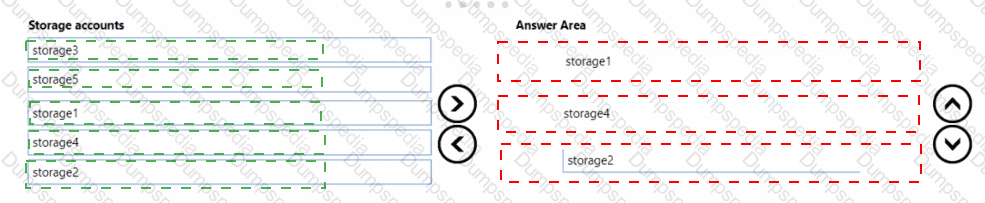 Which three storage accounts should you identify in sequence? To answer, move the appropriate accounts from the list of accounts to the answer area and arrange them in the correct order.