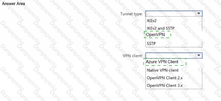 Which type of tunnel should you configure, and which VPN client should you configure on the users' devices? To answer, select the appropriate options in the answer area.