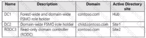 Your network contains a two-domain on-premises Active Directory Domain Services (AD DS) forest named Contoso.com. The forest contains the domain controllers shown in the following table.