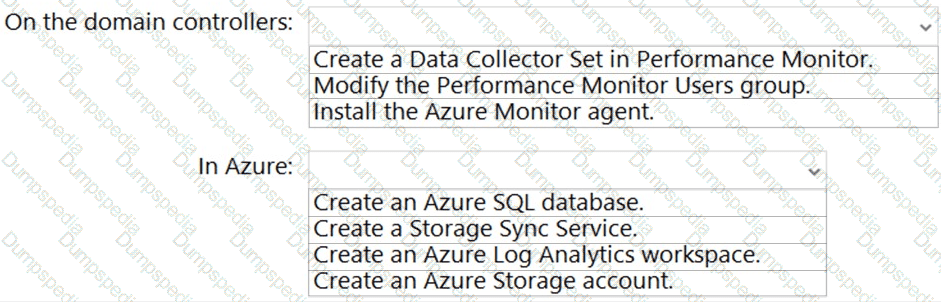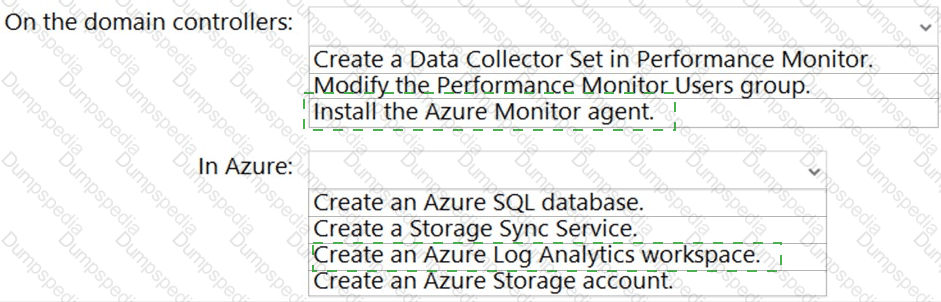What should you do on the domain controllers, and what should you create on Azure? To answer, select the appropriate options in the answer area.