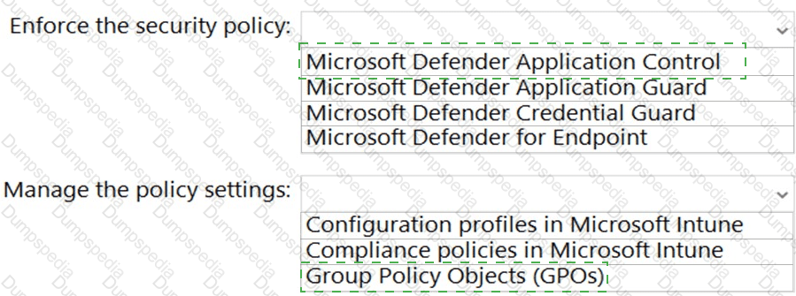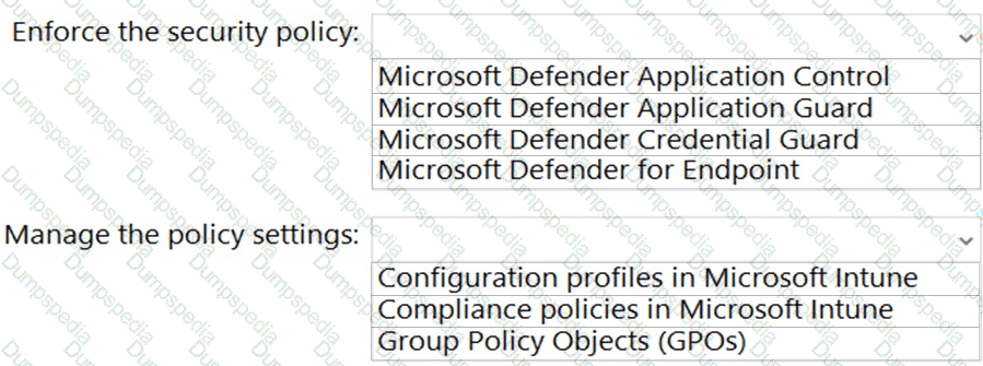 Which service should you use to enforce the security policy, and what should you use to manage the policy settings? To answer, select the appropriate options in the answer area.