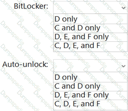 On which volumes can you turn on BitLocker, and on which volumes can you turn on auto-unlock? To answer, select the appropriate options in the answer area.