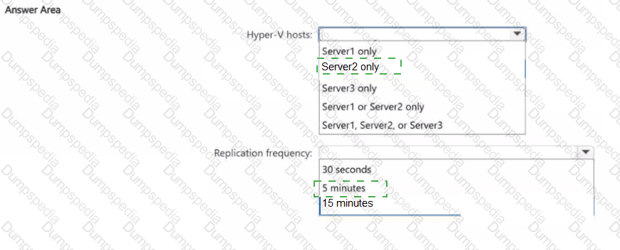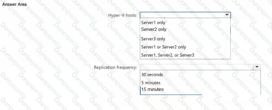On which Hyper-V hosts can you configure the replication, and what is the minimum replication frequency you can use? To answer, select the appropriate options in the answer area.