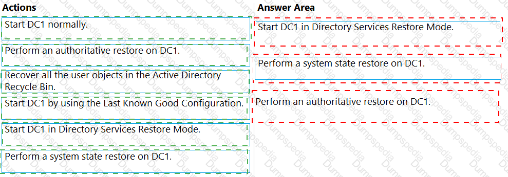 Your network contains an Active Directory Domain Services (AD DS) domain that has the Active Directory Recycle Bin enabled. The domain contains two domain controllers named DC1 and DC2. The system state of the domain controllers is backed up daily at 23:00 by using Windows Server Backup.