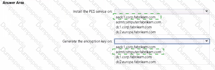 You are planning the europe.fabrikam.com migration to support the on-premises migration plan-Where should you install the Password Export Server (PES) service, where should you generate the encryption key? To answer, select the appropriate options in the answer area.