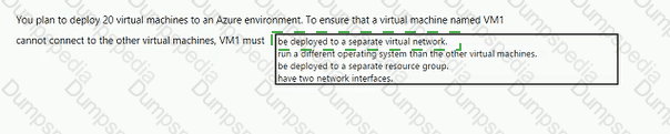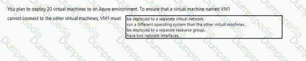You plan to deploy 20 virtual machines to an Azure environment. To ensure that a virtual machine named VM1 cannot connect to the other virtual machines, VM1 must be deployed to a separate virtual network.