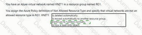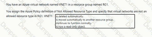 You assign an Azure policy specifying that virtual networks are not an allowed resource type in RG1. VNET1 is deleted automatically.