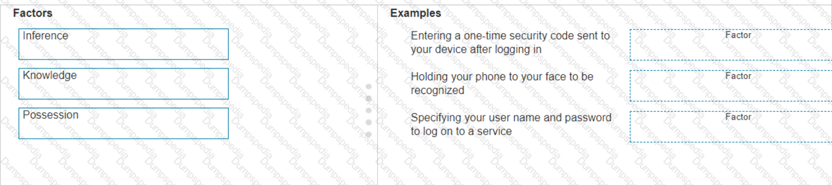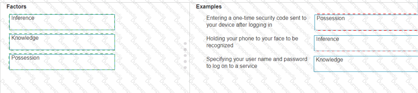 Move the MFA factors from the list on the left to their correct examples on the right. You may use each factor once, more than once, or not at all.