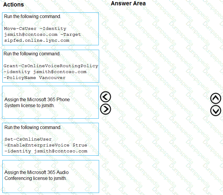 You need to migrate a Vancouver facility user named jsmith from Skype for Business Server to Teams.